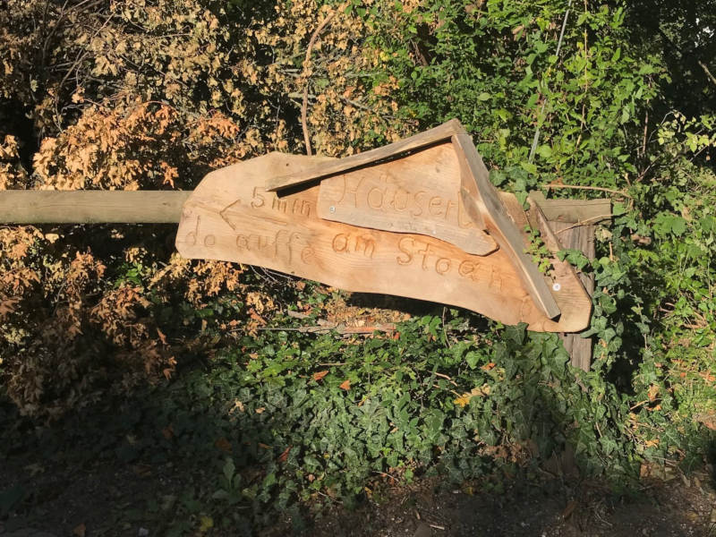 Wir sind auf der Zierleitengasse geblieben, die sanft ansteigend erst durch die Weinberge führt. Später geht es in einen asphaltierten Weg über, der an Villen vorbei durch Wald führt. Der Weinwanderweg wäre dann links in die Dreimarksteingasse abgezeigt. Wir erkundeten aber noch ein wenig die steile Zierleitengasse, die zur Höhenstraße hinaufführt. Das Häuserl am Stoan am Stadtwanderweg 2 ist z. B. in 5 Minuten erreichbar.
