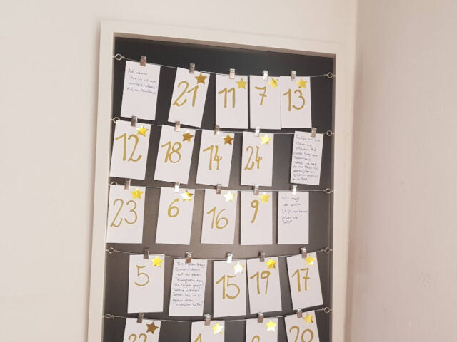 Den Rahmen für diesen Adventskalender habe ich im Weihnachtsabverkauf des Vorjahres verbilligt gekauft. Heute hängen immer wieder neue Fotos drinnen. Eine günstige Variation dazu ist eine Briefchen-Girlande. Die Briefchen kann man mit ganz normalen oder mit kleinen Deko-Wäscheklammern an eine Schnur hängen und damit die Wohnung dekorieren. Das habe ich einmal für meinen Freund gemacht. Auf jedes kleine Zettelchen habe ich ein berühmtes Zitat geschrieben. Jeden Tag konnte er raten von wem es stammt.