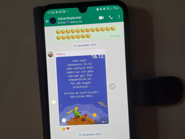 Daher habe ich meine Nichte und meine Tochter in eine Adventkalender-WhatsApp Gruppe eingeladen und ihnen jeden Tag einen stärkenden Spruch, ein witziges Bild oder ein kurzes Video geschickt.