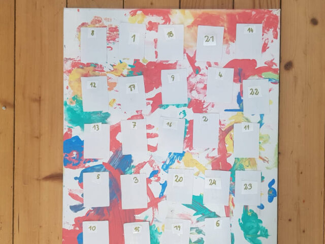 Diesen Adventkalender habe ich als Erinnerung an ein wunderschönes, vergangenes Jahr für meine Kinder gebastelt als sie 6, 4 und 2 Jahre alt waren. Im Vorfeld haben wir gemeinsam eine große Leinwand mit Acrylfarben bemalt.