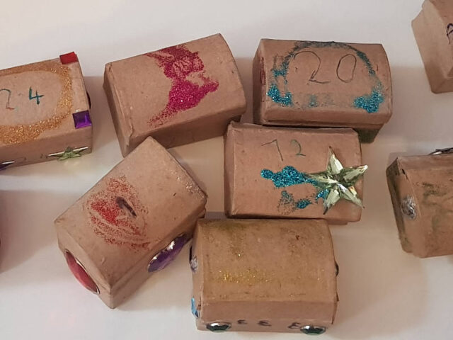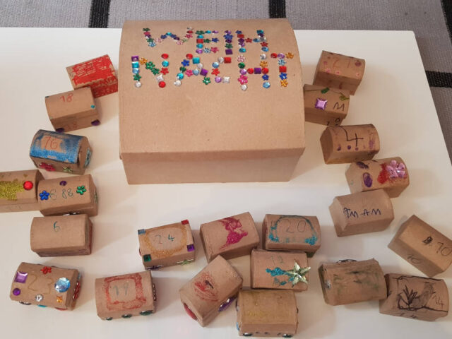 In diesem Jahr wollte ich nicht alleine basteln, ich fand es viel schöner den Adventkalender gemeinsam mit den Kindern vorzubereiten. Ich bestellte von einem Bastelversand eine große Schatztruhe, die mit 36 kleinen Schatztruhen gefüllt war. Wir verzierten und nummerierten zusammen die große und 24 kleine Schatztruhen. Vom 1. bis zum 24. Dezember gab es bei uns jeden Tag ein kleine Schatzsuche.