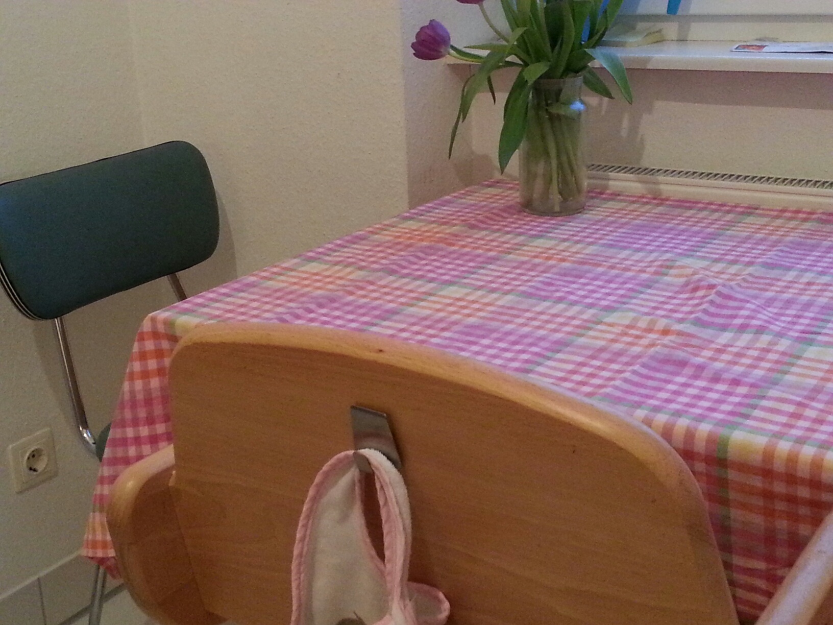 Einfach einen kleinen Hacken auf die Rückseite des Hochstuhls kleben und fertig.
