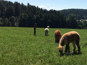Wir teilten uns zu zweit ein Alpaka, was ich ganz angenehm fand, da man so zwischendurch Pause machen kann. Außerdem wechselten wir uns beim Führen der verschiedenen Tiere ab. Spannend fand ich, dass man selbst im Laufe einer so kurzen Zeit merkt, wie sehr sich die einzelnen Tiere charakterlich unterscheiden. Manche ließen sich ganz einfach führen, gingen den anderen Tieren nach und achteten selbst darauf, dass nicht zu groß wurde. Das sind die sogenannten Herdentiere, sie wollten bei der Herde bleiben. Andere wiederum fraßen zwischendurch und hatten es dann eilig, den anderen nachzukommen. Da musste man dann einen kleinen Sprint „hinlegen“. Zum Glück nur ein kurzes Stück. Dann war da noch ein sehr eigenwilliger Hengst. Man musste erst einmal herausfinden, wie man ihn am besten dazu überreden konnte, dort hin zu gehen, wo wir anderen waren.