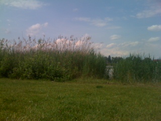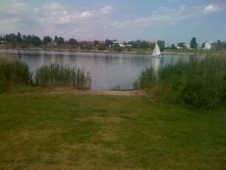Die Wiese ist groß (23.000m2 🙂 ) und im hinteren Bereich stehen große Bäume, die Schatten spenden. Vorne beim Wasser ist ein Schilfgürtel, der nur von ein paar Einstiegstellen durchbrochen ist. Schilf find ich mit kleineren Kids ungünstig, weil man da die Kinder nicht sieht, wenn sie allein beim Wasser sind. Dazwischen gibt es Wiese, auf der man gut Frisbee oder Fußball spielen kann. Außerdem stehen noch einige Bank-Tisch Kombinationen herum und es gibt bei den Bäumen hinten einen großen liegenden Kletterbaum.