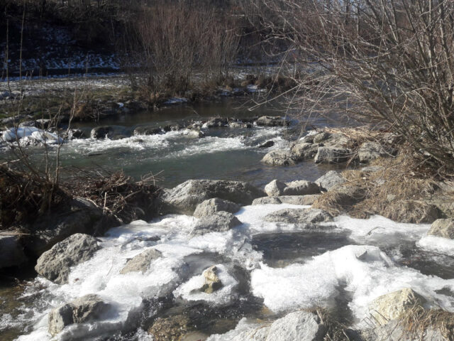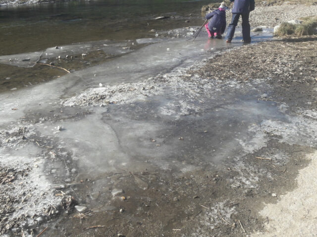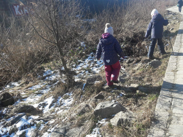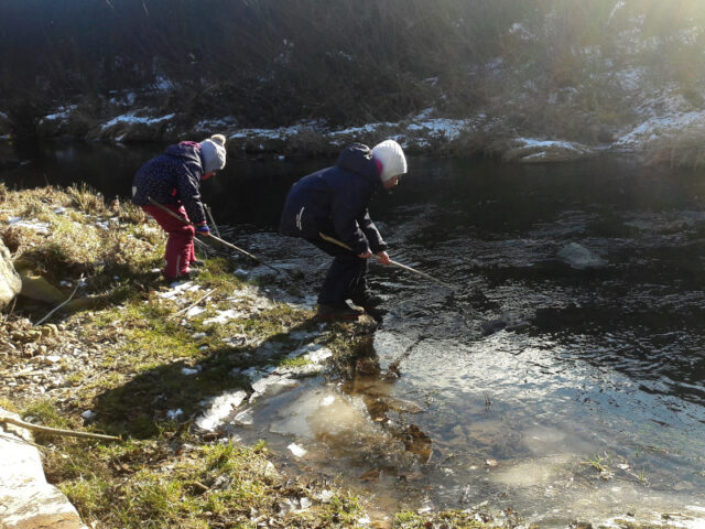 Nach ca. 20 Minuten wird es immer naturnaher. Wir haben diesen Ausflug an einem sehr kalten, aber sonnigen Wochenende gemacht. Die Kinder waren begeistert von den eisigen Stellen im Wasser und kaum weiterzubewegen. Entlang des Weges liegen zu dieser Jahreszeit unzählige Stöcke herum, die gleich eingesammelt und in Wanderstöcke, Hexenbbesen etc. umfunktioniert wurden.