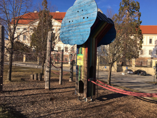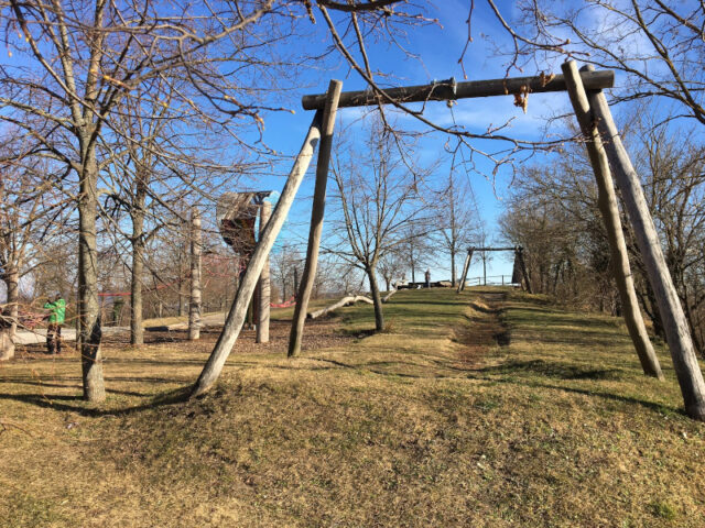 Oben angekommen begrüßt einen gleich einmal ein sehr netter Spielplatz. Es gibt Platz zum Toben und dabei kann man auch eine tolle Aussicht genießen. Es gibt eine Sandkiste und einen Flying Fox. Zum Klettern und balancieren gibt es einen Turm, Seile und Holzpflöcke. Also wer nach dem Aufstieg noch Energie hat, kann sich hier ordentlich auspowern.
