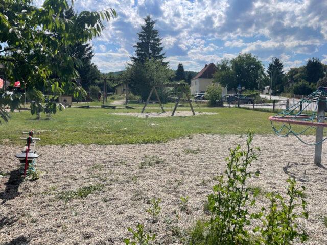 Das Strandbad ist klein und überschaubar. Aber es wirkt mit seinen rot-weiß gestrichenen Badehaus und Umkleidekabinen aus Holz einfach nett und einladend. Den Spielplatz sieht man schon von außen, weil er weit weg vom Wasser auf der Wiese angelegt wurde. Dabei sind die Spielgeräte über die Wiese verstreut. So lädt ein Kletternetz, Schaukeln, eine Kletter-Rutsch-Kombi und eine beschatteten Sandkiste die Kleinen zum Spielen ein.