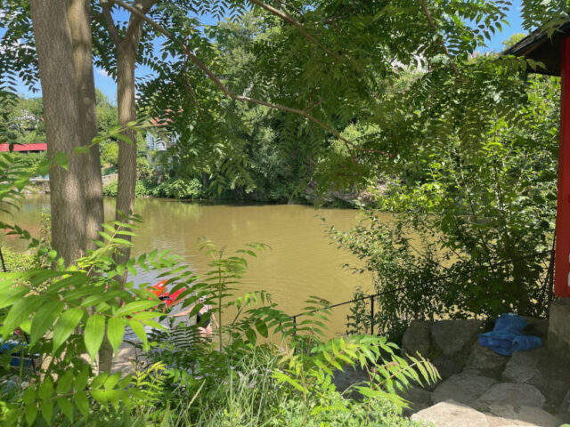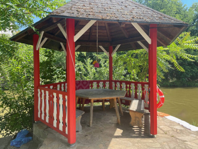 Der Eintritt ist gratis, bzw. gegen eine freie Spende. Eine kleine Gastronomie mit Gastgarten „Das Bachmann“ heißt Besucher*innen gleich beim Eingang willkommen. Daneben ist ein Tischtennistisch und ein kleiner Holz-Pavillon von dem links und rechts Stiegen zum Fluss hinunter führen.