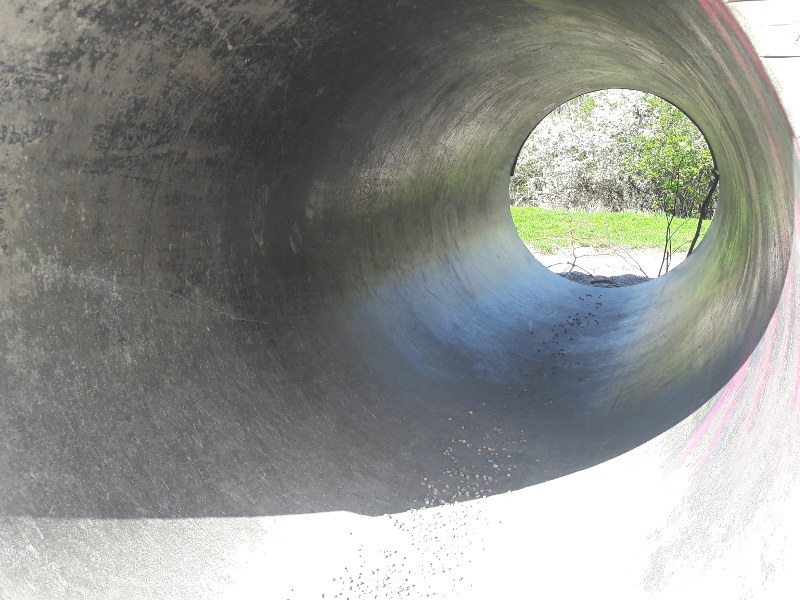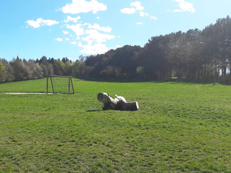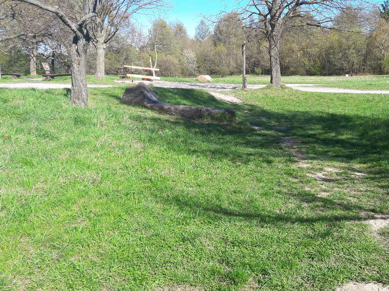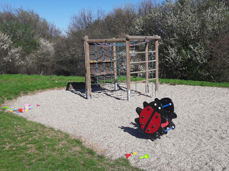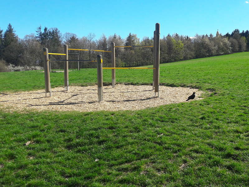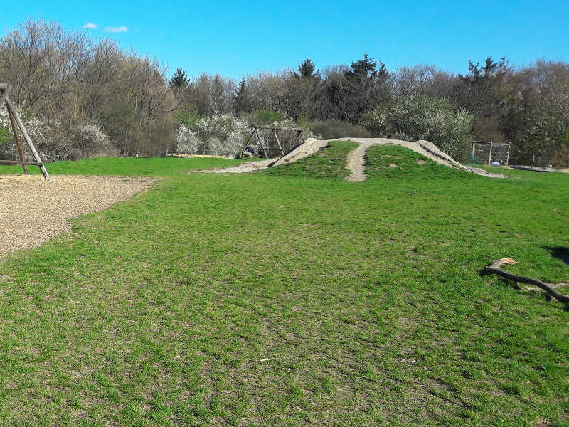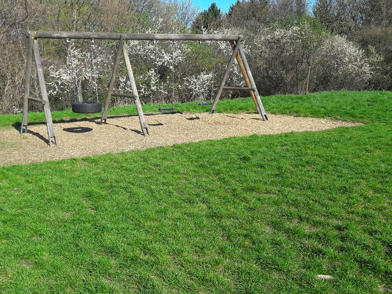 Der Spielplatz ist auf einer großen freien Wiese. Schatten gibt’s nur am Rand. Auf einer Seite gibt es eine schattige Sandkiste und eine Tisch-Bank-Kombination. Die Spielgeräte sind fast alle aus Holz. Es gibt Schaukeln, ein kleines Klettergerüst, Reckstanden, eine Wippe und einen Kriechtunnel. Die Auswahl der Spielgeräte ist in meinen Augen eher klein, dafür haben die Kinder viel Platz zum Austoben und Ballspielen. Also wer dran denkt, unbedingt einen Ball, ein Frisbee oder so mitnehmen.