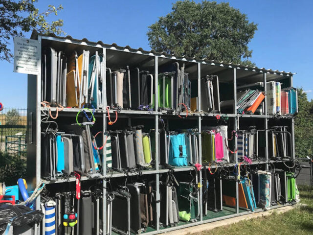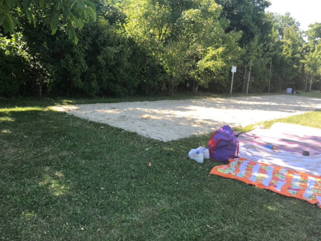 An der hinteren rechten Ecke befindet sich der Kinderstrand, wo es seicht über groben Kies hineingeht. Manche haben da ganz schön gestöhnt, andere sind mit Wasserschuhen hineingegangen. Eine Bank im Wasser war beliebt für Zuschauer_innen und große Steine markieren den Bereich, wo es tiefer wird. Außerdem gibt es die Möglichkeit, mitgebrachten Strandliegen gratis unterzustellen, ihr müsst nur ein Fahrradschloss mitbringen.