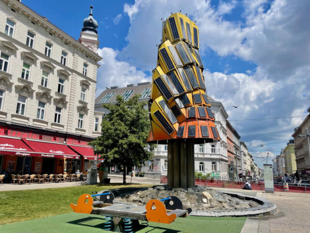 Ich hatte in der Pflege Rudolfsheim-Fünfhaus zu tun und bin dabei nach vielen Jahren wieder einmal am Kardinal Rauscher Platz vorbeigekommen. Der Platz hat sich dermaßen verändert, dass ich ihn eigentlich nur an der Kirche wiedererkannt habe. Am Eingang begrüßt der Lebensbaum von Hans Muhr die Besucher*innen, ein futuristischer Solarturm der zum Erkunden einlädt. Bänke führen am Rand entlang und sind von bunten Blumenbeeten gesäumt. Selbstverständlich gibt es auch einen Trinkwasserbrunnen und ganz hinten bei der Kirche steht ein ÖKlo.