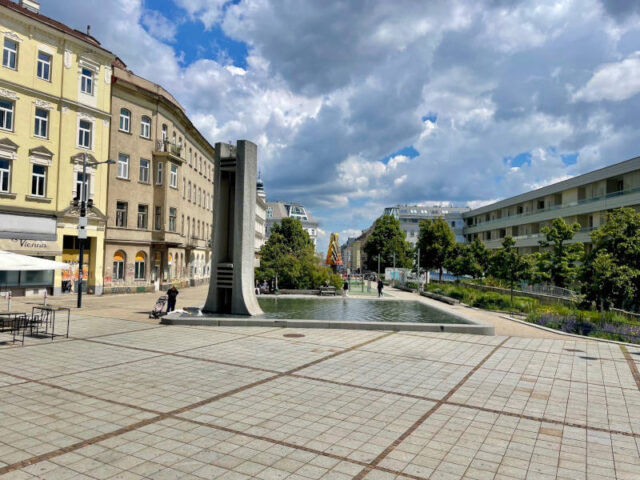 Das große Becken bei der Kirche stellt auch den Beginn der Wiener Wasserwelt dar. Das ist eine Wasserkunst-Installation, welche die ursprünglich sieben verschiedenen Brunnenanlagen verbindet. Das ist auch schon alles! Also der Kardinal Rauscher Platz bietet keinen großen Spielplatz, der einen Ausflug wert ist. Aber ich finde, mehrere solche Plätze mitten in der Stadt tragen unglaublich zur Lebensqualität bei und sind ganz nebenbei ein Bekenntnis, dass Wien wirklich eine Stadt für Alle sein will.