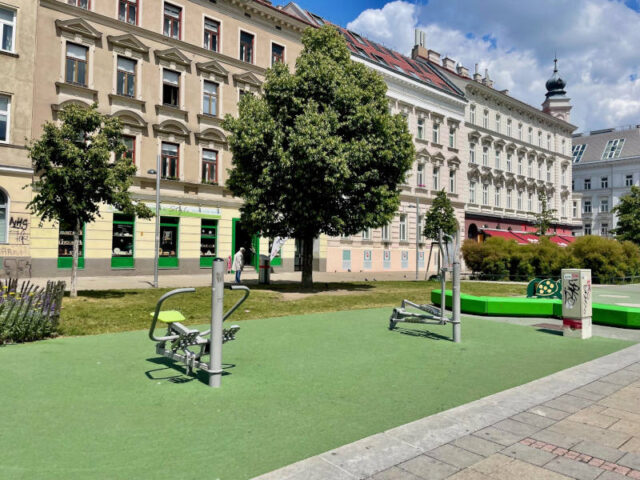 Aber neben den Spielgeräten auf Spielplätzen sind auch immer mehr Plätze in der Stadt kinderfreundlich ausgestattet wie z.B. der Kühnplatz. Diese Plätze verfügen neben Fallschutzböden, die auch gut mit einem Rollstuhl befahrbar sind, auch immer mehr über Spielgeräte, die alle Kinder einladen, wie z.B. der St. Elisabeth Platz im 4. Bezirk. Hier stelle ich euch den Kardinal-Rauscher-Platz im 15. Bezirk vor.