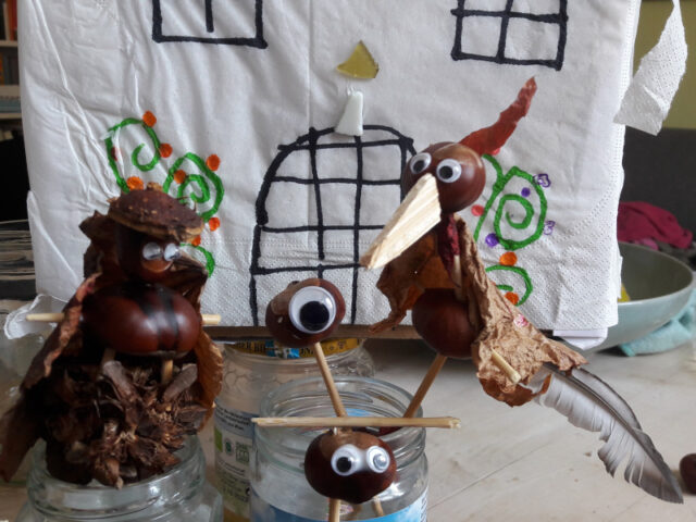 - Kastanienvogel: Eine kleinere Kastanie wird der Kopf. Den Schnabel haben sie aus einem Holzrest gemacht. Die Ältere hat ihn etwas zugespitzt, damit er mehr nach Schnabel aussieht, und angeklebt. Auf der Unterseite braucht der Kopf ein Loch für den Hals.