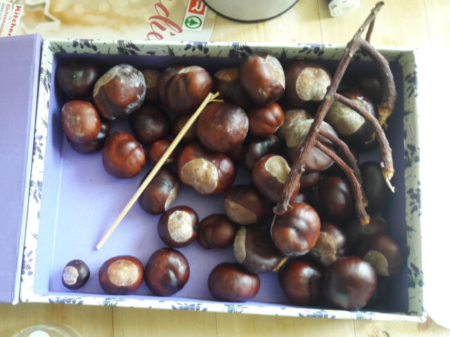 - Kastanien, Kastanienschalen, Blätter, Stöcke, ….