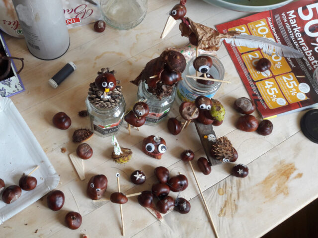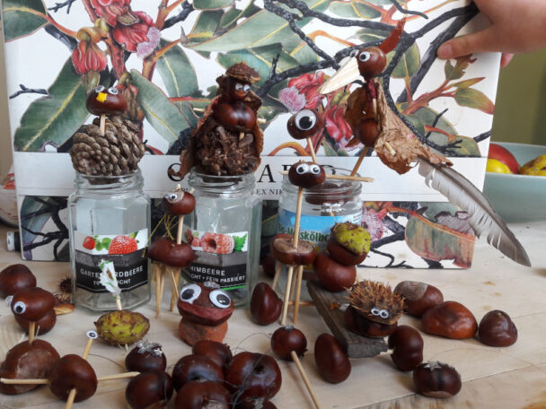 Nachdem meine beiden Mädchen (5 1/2 und 8) noch immer große, leidenschaftliche Sammler_innen sind, haben wir momentan jede Menge Kastanien, Blätter usw. zu Hause. Obwohl sie in der Schule und im Kindergarten sowieso in dieser Jahreszeit mit Naturmaterialien basteln, ist ihrer Begeisterung fürs Basteln mit Kastanien kein Abbruch getan. So oft wie möglich wird bei uns zu Hause an der Kastanien-Maxerl-Welt weitergearbeitet.