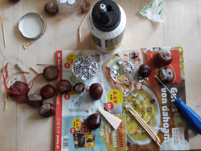 - Kastanienmaxerl: Zwei unterschiedlich große Kastanien mit Klebstoff verbinden, Kulleraugen, Kastanienschale als Hut und ein Blatt oder ein Stück Papierserviette als Umhang – voilà.