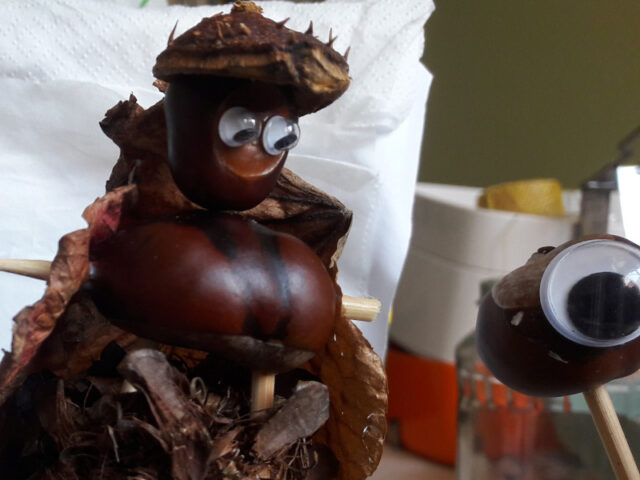 - Kastanienaliens: Dazu braucht ihr nur Kastanien, verschieden große Kulleraugen und Klebstoff.