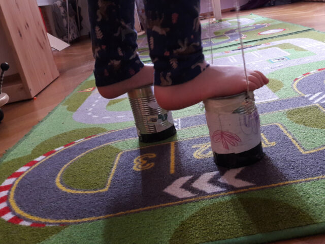 Damit der Weg von Station zu Station noch lustiger wird, haben wir gemeinsam Dosenstelzen gebastelt. Nachdem wir nicht im EG wohnen und wir unsere Nachbar_innen mögen, haben wir auf die Unterseite der Dose Karton mit Malerkrepp als Bodenschutz und Schalldämpfer geklebt.