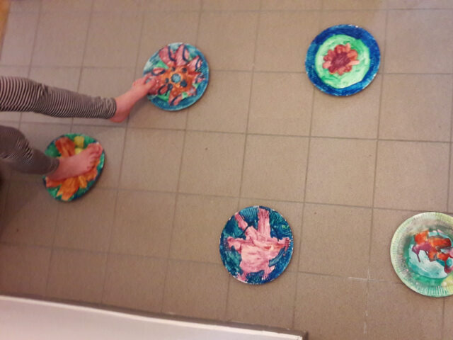 Ursprünglich waren es weiße Pappteller, die ich im Vorraum aufgelegt habe. Mit der Zeit haben die beiden immer mehr Pappteller angemalt und in echte Seerosen verwandelt. Je nach Bodenbeschaffenheit ist es ratsam, sie mit Tixo oder Malerkrepp zu befestigen damit sie nicht ausrutschen.