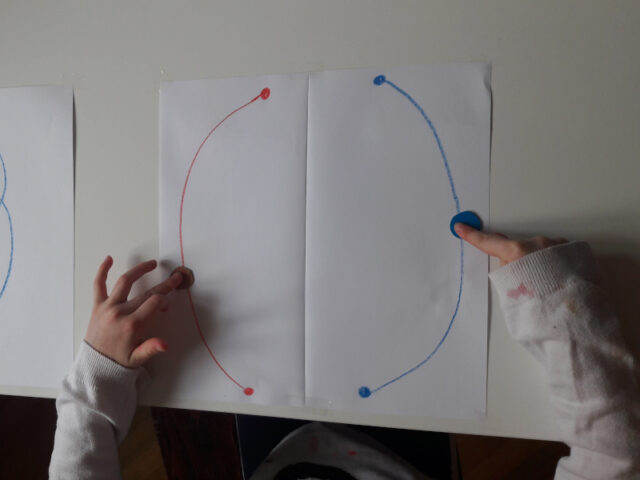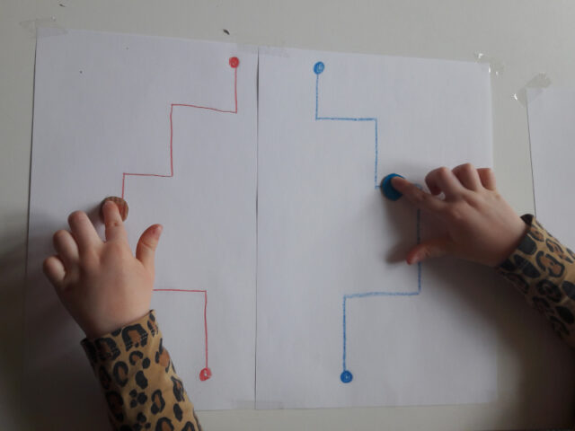Fürs Synchron-Fingerrrennen müsst ihr auf einem Blatt Papier jeweils in Blau und gespiegelt in Rot entweder einen Bogen oder Schlangenlinien aufzeichnen. Am Anfang und am Ende einen runden Punkt als Start bzw. Ziel einzeichnen. Ich habe vier unterschiedliche Blätter vorbereitet und mit Tixo auf der Tischplatte fixiert. Damit sie einerseits vier unterschiedliche Strecken haben und es zu keinem Stau, Frust und anschließendem Streit kommt. Die beiden Knöpfe bzw. runden Kreise liegen beim Startpunkt. Die Kinder müssen dann mit dem linken und rechten Zeigefinger gleichzeitig der Spur folgen. Die beiden Finger müssen gleichzeitig das Ziel erreichen.