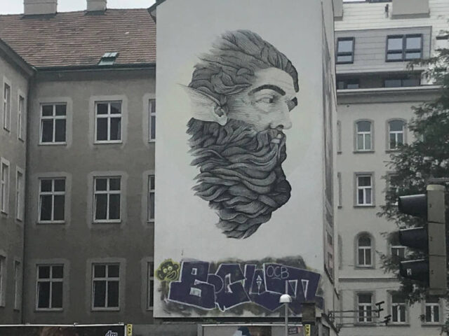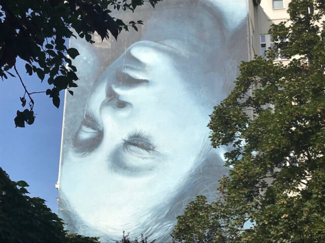 Weiter könnt ihr entweder dem Radweg folgen oder die Magdalenenstraße entlang gehen, da beide zusammenstoßen. Das nächste Kunstwerk erwartet uns in der Magdalenenstraße 12. Es ist nicht in unserer Richtung, ihr müsst euch dort umdrehen um die Wand zu finden, wo die Häuser einen niederen Vorbau haben.