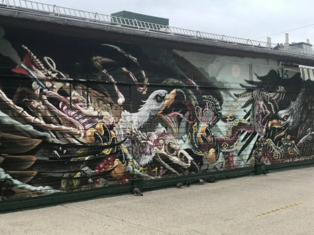 Wenn ihr dem Radweg folgt kommt ihr bald zum Alfred Grünwald Park, der direkt neben dem Naschmarkt liegt. Dort gibt es nicht nur einen sehr netten Spielplatz, sondern an der Wand direkt beim Eingang auch ein tolles Kunstwerk von Gottfried Helnwein. Allerdings ist dies nicht immer zu sehen, da die Fläche Manchmal mit anderen Bildern überspannt wird.