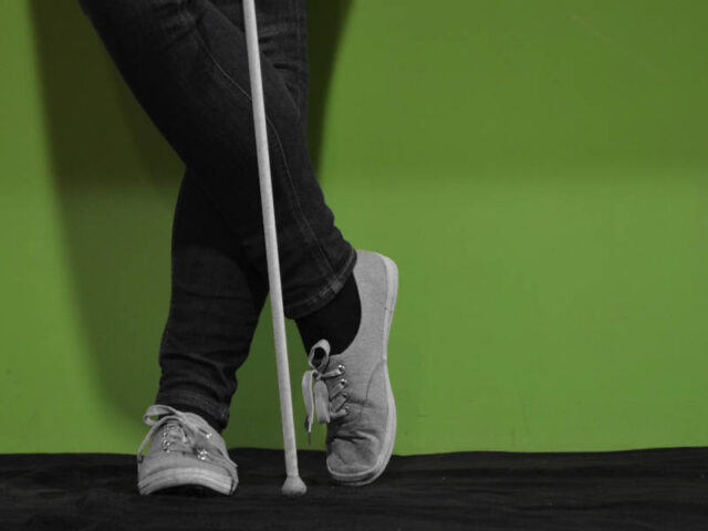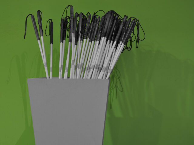 Die Führung findet in Kleingruppen von max. 8 Personen statt. 10 Minuten vor Führungsbeginn sollte man anwesend sein. Am Anfang hat jede Person einen Blindenstab bekommen. Bei der Einführung wurde erklärt, dass wir im „Gänsemarsch“, also einer hinter dem anderen durch die Räume gehen. Den Blindenstab nimmt man in die rechte Hand. Mit der linken Hand tastet man sich an der Wand entlang in den dunklen Raum hinein und während der gesamten Führung durch den Parcours durch. Das ist für Linkshänder*innen wie meinen Sohn und mich nicht so einfach gewesen, als wichtig zu wissen.