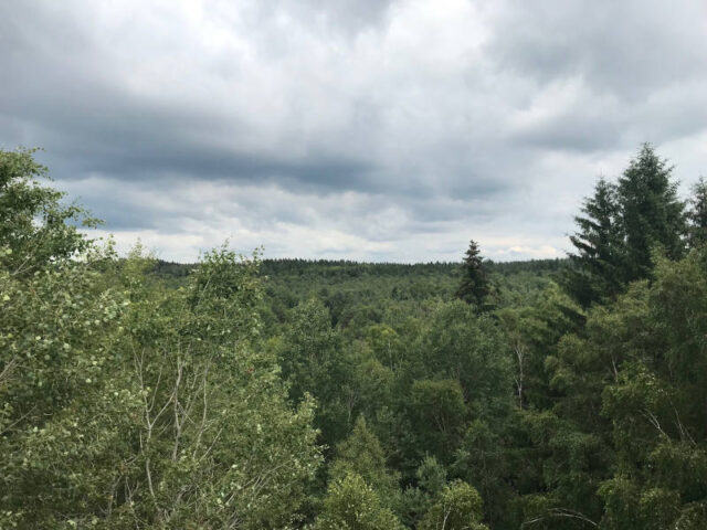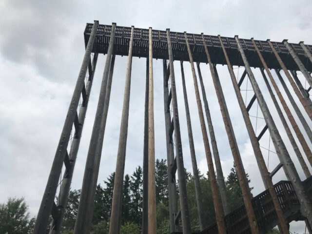 Die Himmelsleiter ist die Aussichtswarte im Naturpark und eine beeindruckende und wirklich schöne Holzkonstruktion. Da geht es von unten über 108 Stufen eine Treppen hinauf. Auf schwindelerregenden 18,4 m führt ein Steg dann zur Plattform am Ende und man kann rundherum den Ausblick genießen. Wie die meisten Aussichtswarten ist auch diese hier gratis.