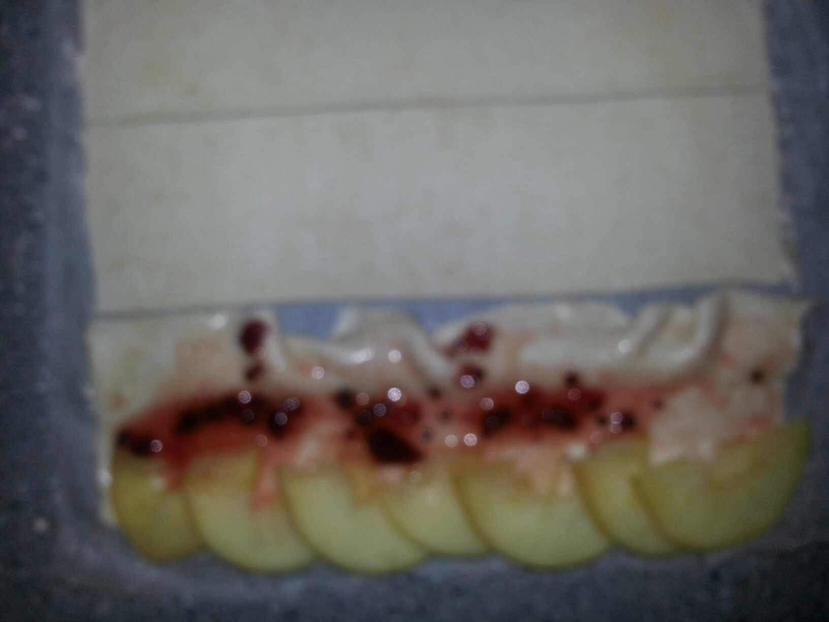 In der Zwischenzeit den Blätterteig ausrollen und in 7-8 cm breite Streifen schneiden. Die Marmelade mit ein paar EL. warmem Wasser anrühren, damit sie sich leichter verstreichen lässt.