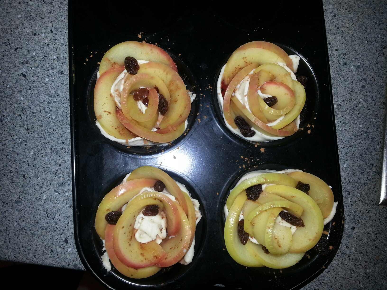 Die weich gekochten Apfelscheiben etwas auskühlen lassen. Die Marmelade auf den Blätterteig streichen, Apfelscheiben auflegen, Zimt darüber streuen und mit geriebenen Nüssen und/oder Rosinen verfeinern. Nun den Blätterteig raufklappen, vorsichtig mit dem Einrollen beginnen und in eine Muffin-Form setzen.