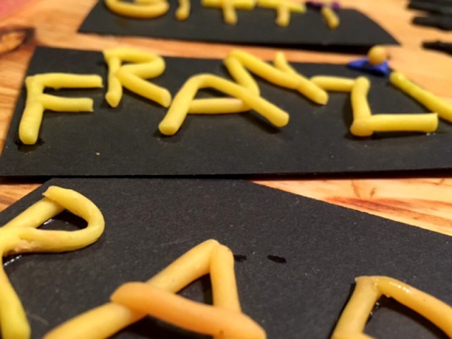 Als die Kinder in die Schule kamen und die Buchstaben lernten, haben wir daraus Buchstaben geformt und Legespiele gespielt. Da wir die Buchstaben später kaum mehr verwendeten, haben wir daraus Namenskärtchen für ein Essen mit Freund_innen gebastelt. Sah sehr nett aus und hat auch den Besucher_innen Freude gemacht.