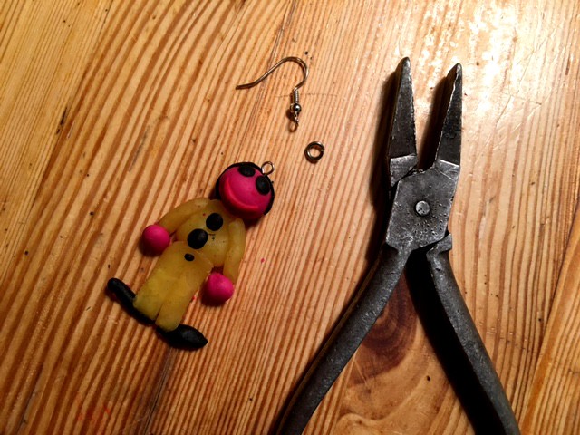 Kettelstifte sind Drahtstifte mit einer Schlinge an einem Ende, die bekommt ihr z.B. im Perlengeschäft. Den Kettelstift könnt ihr auch mit einem Seitenschneider gut in der passenden Länge abschneiden. Anschließend werden die halbfertigen Ohrringe ins Backrohr gegeben und durch Backen gehärtet. Nachher müsst ihr die Ohrhaken mit einer Öse an den Kettelstift, der in der Figur steckt, anbringen und schon sind die Ohrringe fertig.