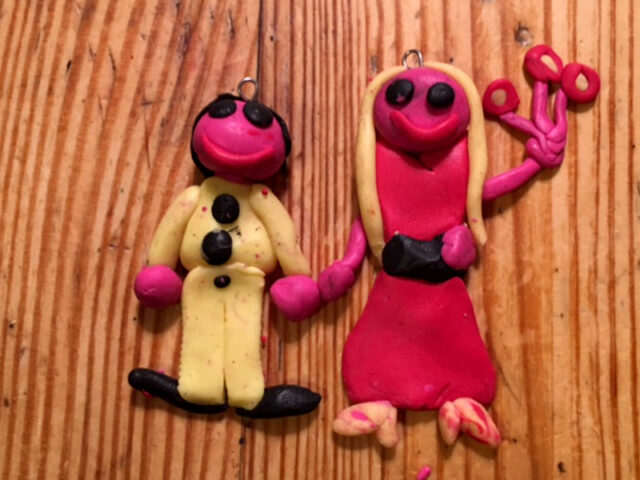 Wir haben auch einmal Ohrringe aus Fimo gemacht. Dazu können eure Kinder einfach etwas gestalten, was sie gerne mögen. Egal ob Käfer, Figur oder Kügelchen, wichtig ist nur, dass oben das Fimo ein bisschen dicker ist, damit man dort einen Kettelstift hineinstecken kann.
