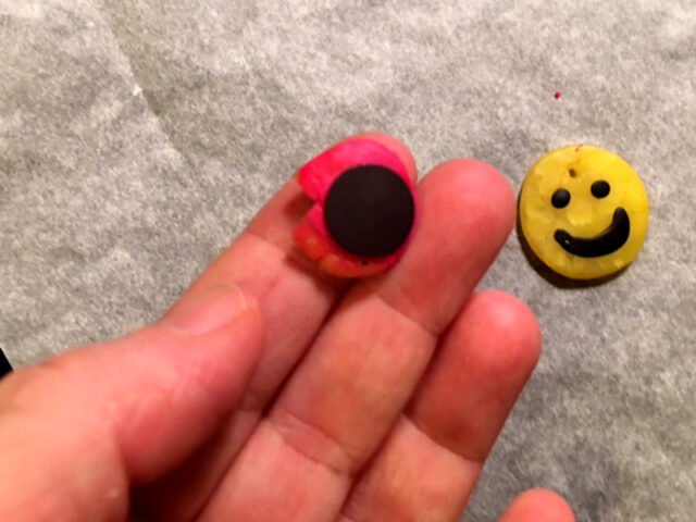 Da wir von einer anderen Bastelei noch Magnetklebeblättchen hatten, haben wir ein paar kleine Magnete gemacht. Dazu können die Kinder etwas mehr oder weniger Flaches formen, das in der Größe zur Stärke des Magneten passt. Das Teil wird dann im Backrohr gehärtet und erst nachher klebt ihr den Magneten drauf. Auch kaputte Magneten können auf diese Art aufgehübscht werden.
