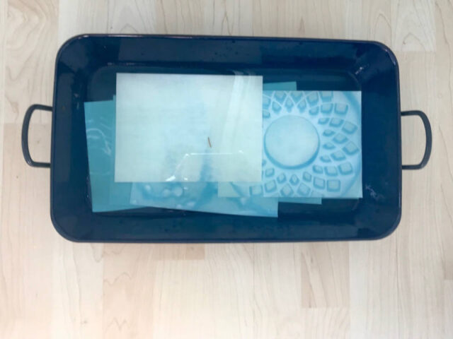 - Anschließend werden die Gegenstände entfernt und das Papier im Schatten ins Wasserbad gelegt. Bei mir stand einige Minuten und keine genauere Zeitangabe. Zuerst seht ihr den Abdruck des Gegenstandes, dann verschwindet er und dann taucht das Negativ des Gegenstandes wieder auf. Wenn das sichtbar war, haben wir die Blätter aus dem Wasser genommen und wieder am Bild zum Trocken aufgelegt. Dafür benötigt man schon ein bisschen Geduld, aber da unsere Blätter nur A5 waren und es ein wirklich heißer Tag war, ging es schneller als gedacht. Dass die Kinder sich in der Zwischenzeit am Spielplatz austoben konnten, war aber hilfreich.