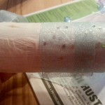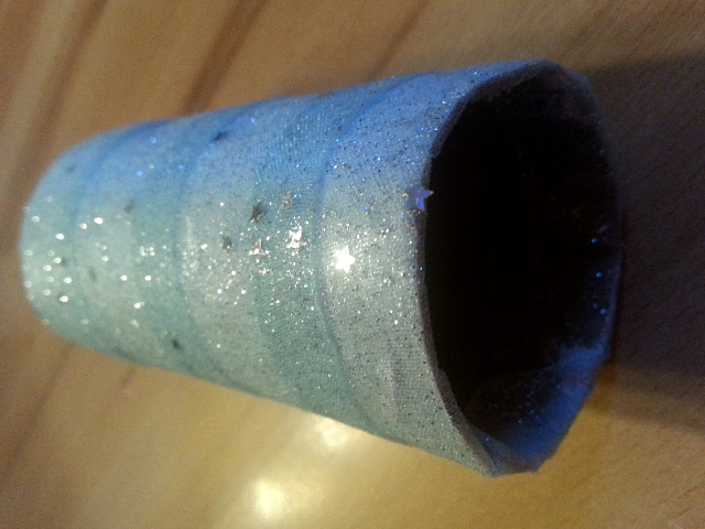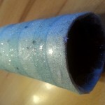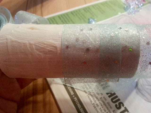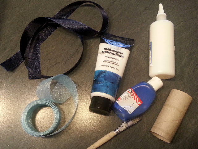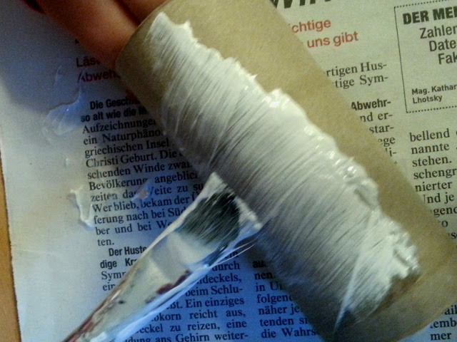 Die Klopapierrolle haben wir weiß angemalt, denn das ausgesuchte Band war durchsichtig. Nach dem Trocknen haben wir die Rolle mit Bastelkleber bepinselt. Dann wurde das Band herumgewickelt und seitlich eingeschlagen. Ihr könnt genauso Papier oder eine hübsche Serviette draufkleben. Anschließend alles gut trocknen lassen.