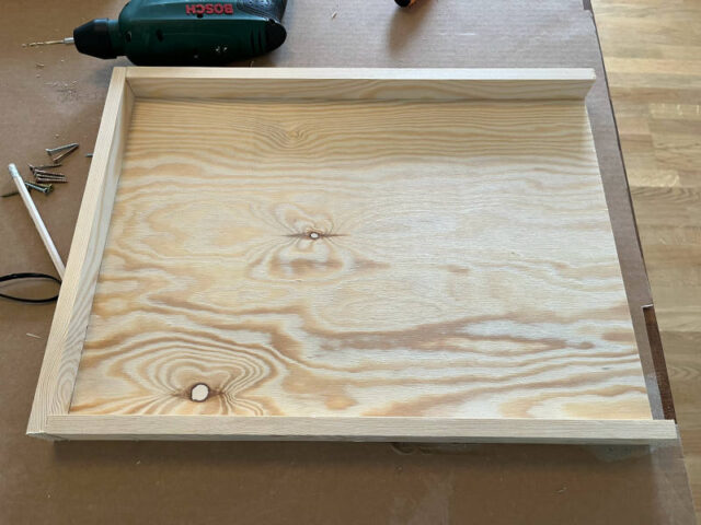 Ich habe mich dafür entschieden die Holzleisten einfach auf den Außenseiten des Brettes anzubringen statt auf der flachen Seite. Dadurch ist zwar das Fassungsvermögen innen ein bisschen größer in der Fläche, aber die Bilder können dafür nicht so herumrutschen.