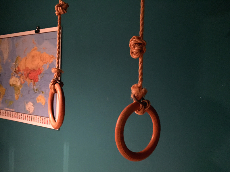 Während dem Studium hatte ich eine Freundin, die einige Jahre in Afrika gelebt hat. Von dort inspiriert, lagen in ihrem großen Wohnzimmer in der Ecke 2 Matten, darüber waren 2 Ringe befestigt. Schlicht aber gut genutzt. Ihre Kinder turnten dort herum wie kleine Affen und ich hab sie insgeheim immer beneidet.
