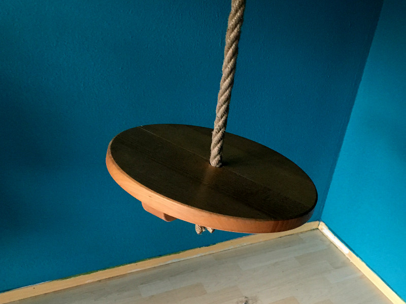 Also hab ich dann im Kinderzimmer meiner Töchter auch 2 Haken an der Decke angebracht. Daran wurde im Laufe der Zeit eine Tellerschaukel, eine Hängeleiter, zwei Ringe, ein Trapez, ein Sitz, Hängematten oder Decken befestigt. Im Nachhinein war das mit Sicherheit das Spielgerät, das bei uns am häufigsten genutzt wurde. Egal ob als Actionspielgerät oder zum Abhängen. Auch bei Freundinnen kam es gut an.
