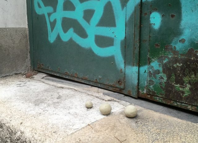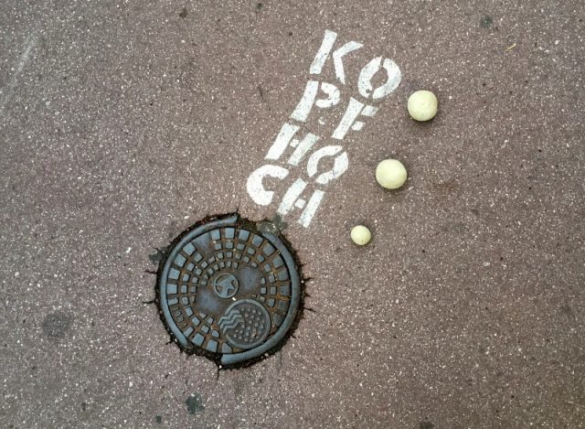 Ein paar der Lehmkugeln habe wir mit nach Hause genommen. Bei einem Abendspaziergang mit den Kindern hatte meine Tochter noch welche in der Tasche. Inspiriert von meinem Geburtstagsgeschenk, das Buch Landart in der Stadt haben wir für die Kugeln einen passenden Platz gesucht. Es war lustig, weil man dabei die Stadt ganz anders entdeckt. Hat Spaß gemacht. Welcher Platz gefällt Euch am Besten?