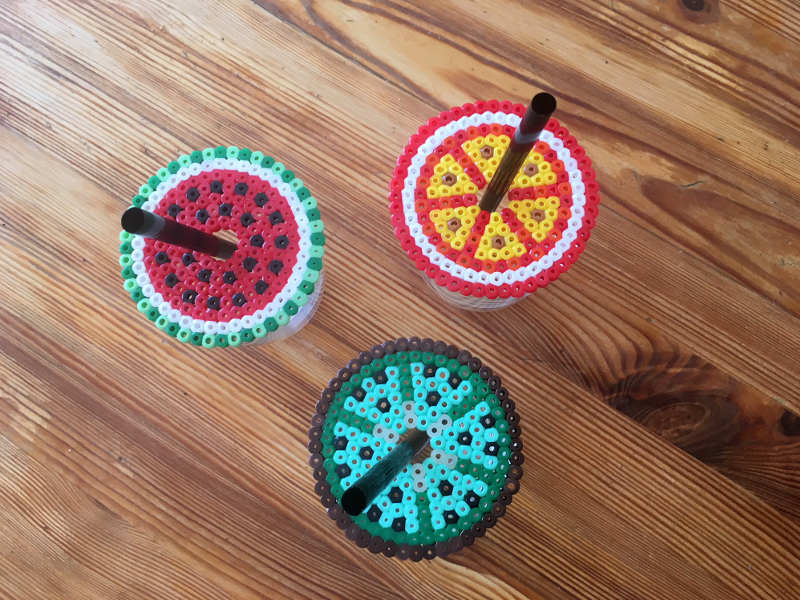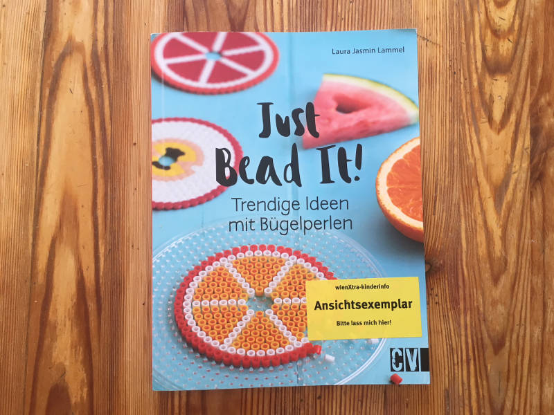Tolle Motive, zum Teil auch coole dreidimensionale Vorlagen findet ihr im Buch „Just Bead It! Trendige Ideen mit Bügelperlen“ vom Christophorus Verlag, das ihr euch hier bei uns in der kinderinfo anschauen oder in den Wiener Büchereien ausborgen könnt. Wir haben daraus zum Beispiel Fliegenschutz für Gläser gebastelt, die unterschiedliche Früchte darstellen sollen. Ich finde, es ist ein netter Hingucker und ein liebes kleines Geschenk.