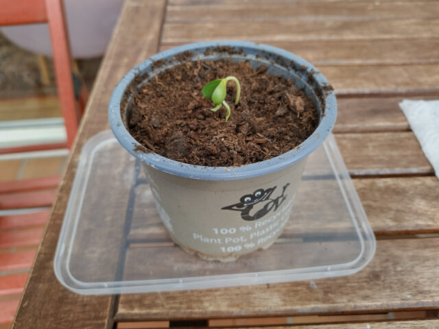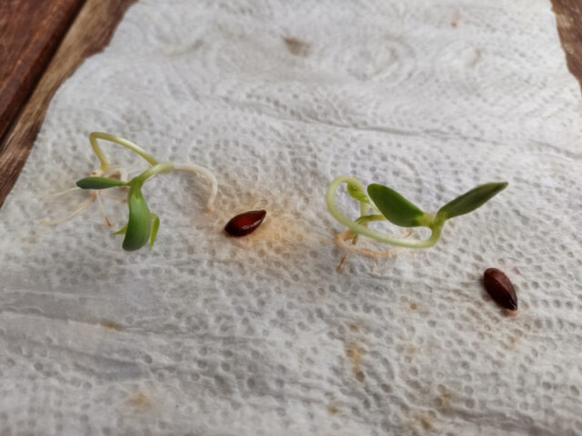 Dann kommt die Küchenrolle mit den Kernen in eine verschließbare Plastikbox. Für diese Box sucht ihr nun ein sonniges Plätzchen und lasst es dort 1-2 Wochen stehen. Ich schaue alle paar Tage hinein, um zu sehen ob die Kerne schon keimen und die Küchenrolle noch feucht, aber nicht angeschimmelt ist.