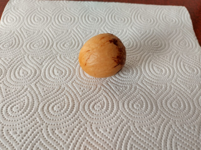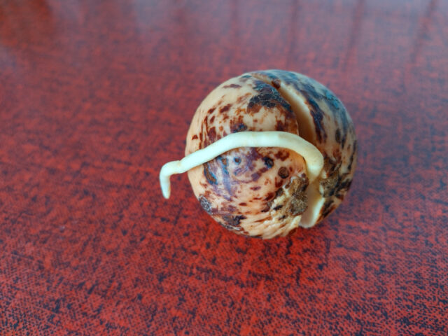 Den „nackten“ Kern lege ich dann in ein Stück Küchenrolle, befeuchte es und lege es in eine verschließbare Plastikbox, so wie bei den Apfelkernen. Es kommt ganz auf den Kern darauf an, wie lange es dauert bis sich der Kern spaltet und ein Trieb herauskommt. Es hat bei mir schon mal nur 1 Woche gedauert und ein anderes Mal 2 Monate. Also ein wenig Geduld braucht man schon. Wenn der Kern aufgebrochen ist, dann warte ich bis die Wurzeln ein wenig hinauswachsen. Sobald ihr eine 2-3 cm lange Wurzel seht, könnt ihr den Kern einwassern.