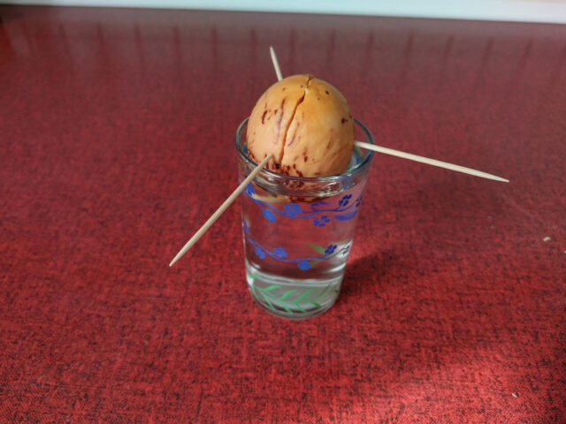 Als nächstes wird der Kern mit 3 Zahnstochern aufgespiest und ungefähr bis zur Hälfte in ein Glas Wasser gelegt. Jetzt kann das Pflänzchen munter vor sich hin wachsen. Eines habe ich seit 10 Monaten im Wasser stehen und es geht dem Pflänzchen noch immer prächtig.