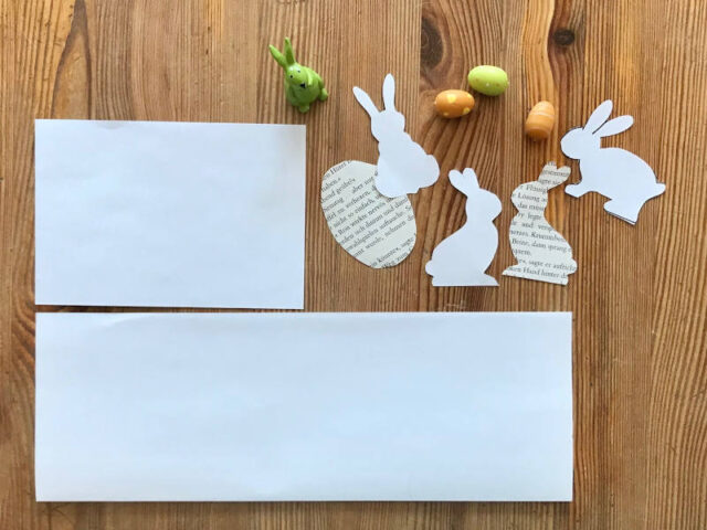 - Die weißen Blätter werden dann der Länge nach gefaltet und der Faltstelle entlang geschnitten. Dann faltet ihr die Blätter noch einmal in der Mitte. So erhaltet ihr eine Karte, die nur noch auf Verzierung wartet. Dafür klebt ihr eure ausgeschnittenen Hasen auf.