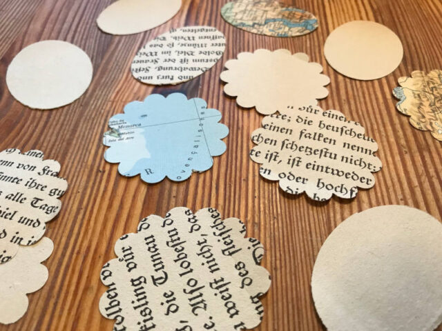 Wenn ihr ein Osternest oder auch ein kleines Geschenk für die Großeltern habt, dann sind vielleicht Namenskärtchen oder Geschenkanhänger hilfreich. Diese lassen sich ganz einfach aus alten Büchern oder Zeichnungen herstellen. Dafür benötigt ihr neben dem gestalteten Blatt noch ein Papier, das ihr für die Hinterseite verwendet. Das kann weiß oder bunt sein, wie ihr mögt. Tonpapier schaut immer gut aus, aber es geht auch Druckerpapier. Bestimmt habt ihr schon diese großen Locher zum Ausstanzen gesehen, die es in allen möglichen Formen gibt. Diese können meist schon jüngere Kindern bedienen. Wir haben hier Wolken- und Kreis-Stanzer genommen und die Seiten eines sehr alten Buches. Dann müsst ihr nur noch die Vorder- und Hinterseiten zusammenkleben.
