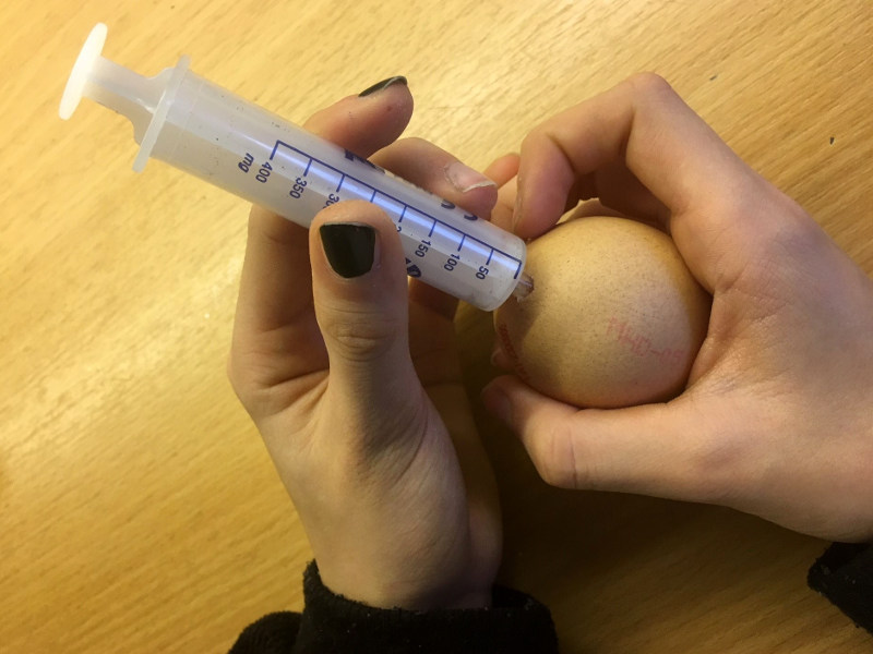 - Als nächstes wird die Einwegspritze vorsichtig in das Loch eingeführt und das Ei ausgesaugt – dabei muss man beachten, dass Luft in das Ei eindringen kann – das Loch muss also größer als die Spritze sein.