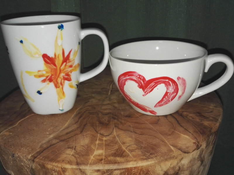 - Schreibt mit den Porzellanmalstiften euren Lieblingsspruch, einen Geburtstagswunsch oder malt eine kreative Zeichnung auf die Tasse bzw. den Porzellangegenstand. Wer lieber „Free-Style“-Malen mag, kann unterschiedliche Porzellanfarben verwenden und freihändig etwas zeichnen. Das können klare Symbole sein, wie ein Herz oder ein Schmetterling. Ich bin eher ein Fan vom abstrakten Malen und vermische die Farben und schaue, was dabei herauskommt. 🙂 Das ist auch für mehrere Altersgruppen geeignet. Wenn euch etwas, das ihr gemalt habt, gar nicht gefällt, dann befeuchtet ein Wattestäbchen und wischt es weg.