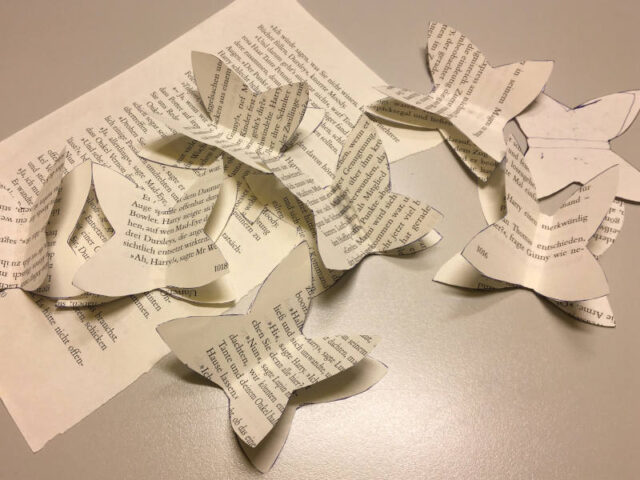 Wir haben seit ein paar Monaten einen offenen Bücherschrank in der WIENXTRA-Kinderinfo. Und weil wir diesen auch länger noch behalten wollen hat er nun einen fixen Platz in der WIENXTRA-Kinderinfo gefunden. Dieser Platz ist gut gefüllt mit Büchern und wartet auf lesebegeisterte Kinder und ihre Eltern. Aber ein bisschen Deko sollte auch nicht fehlen! Bei einer unserer Bücherspenden war ein richtig kaputtes und ramponiertes Buch dabei. Zum verschenken nicht mehr geeignet, aber perfekt für eine kreative Recycling-Deko. Wir haben einfach mal ganz spontan losgebastelt und zeigen euch hier was dabei rausgekommen ist.
